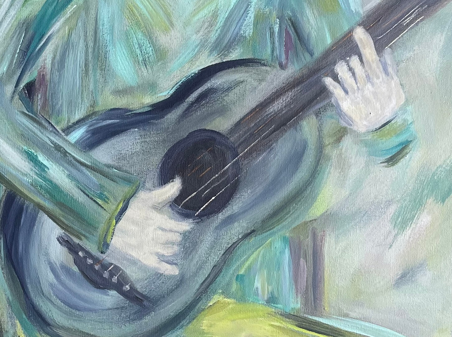 An abstract impressionistic painting of an acoustic guitar player sitting and peacefully practicing their skill