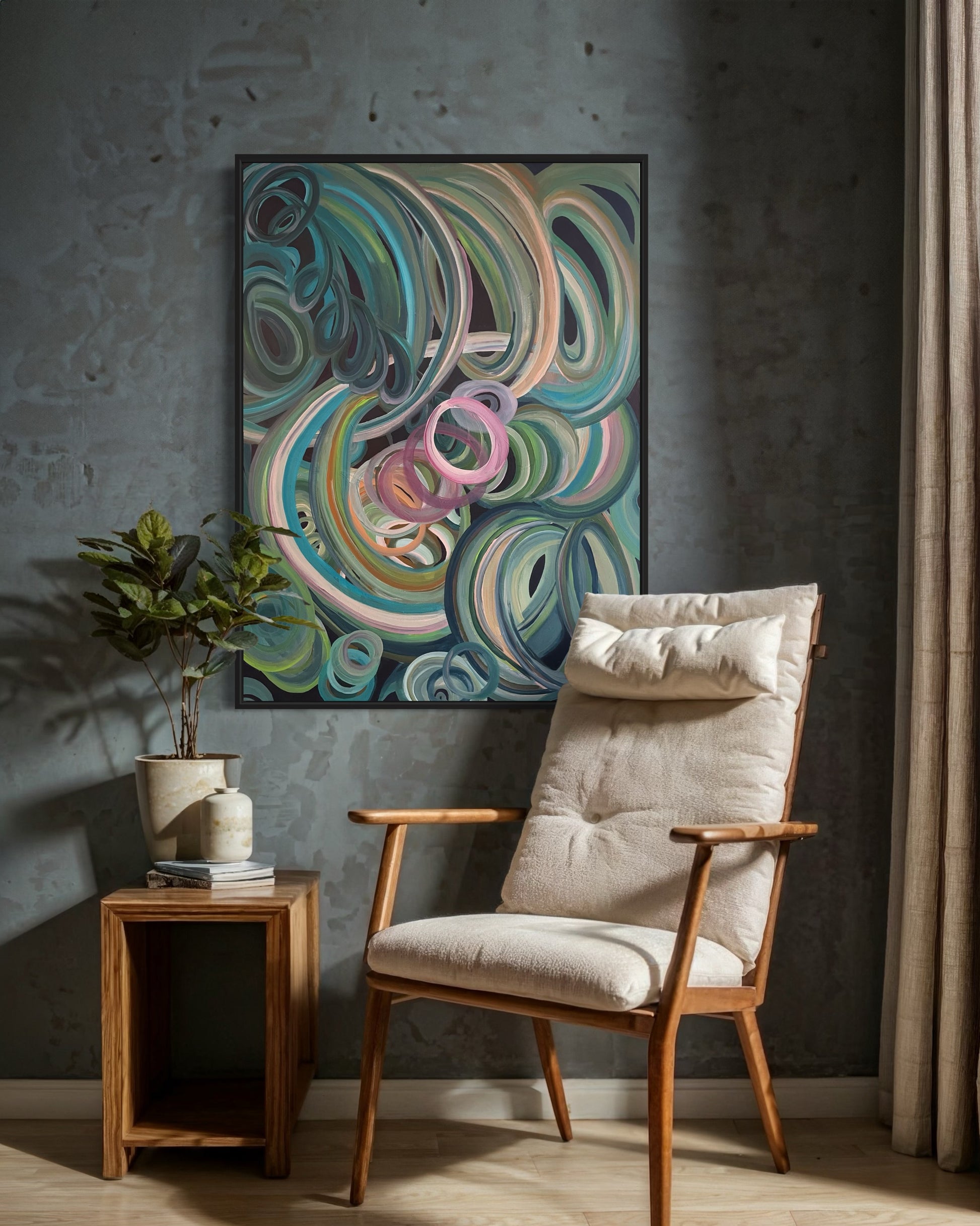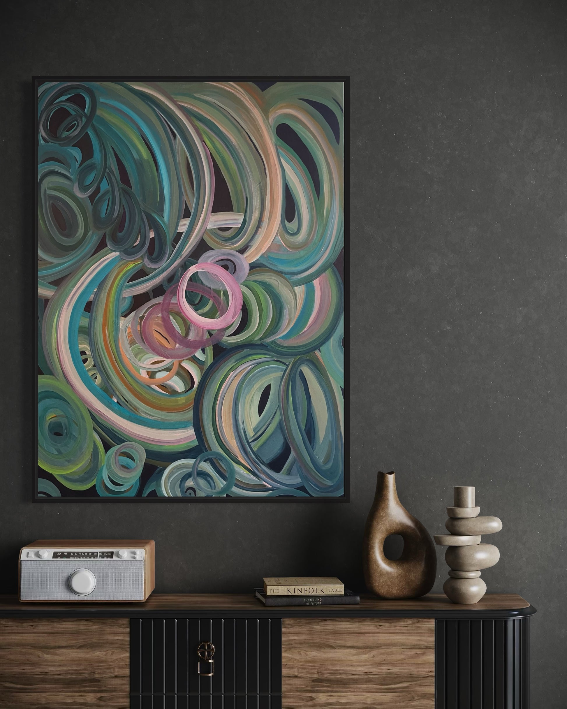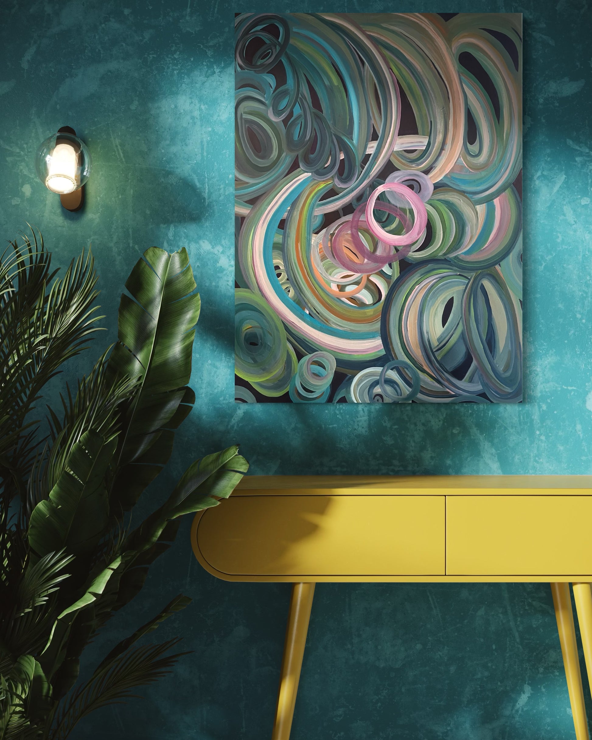acrylic on gallery wrapped canvas with D rings and wire on bac
