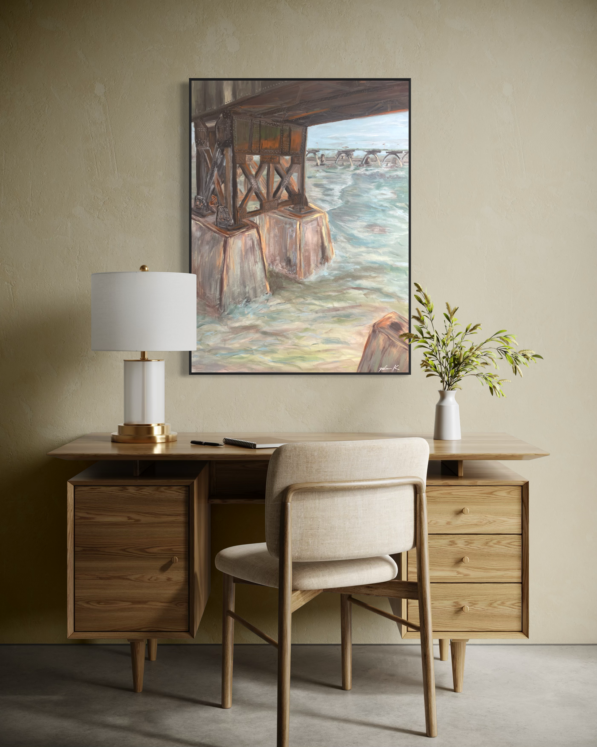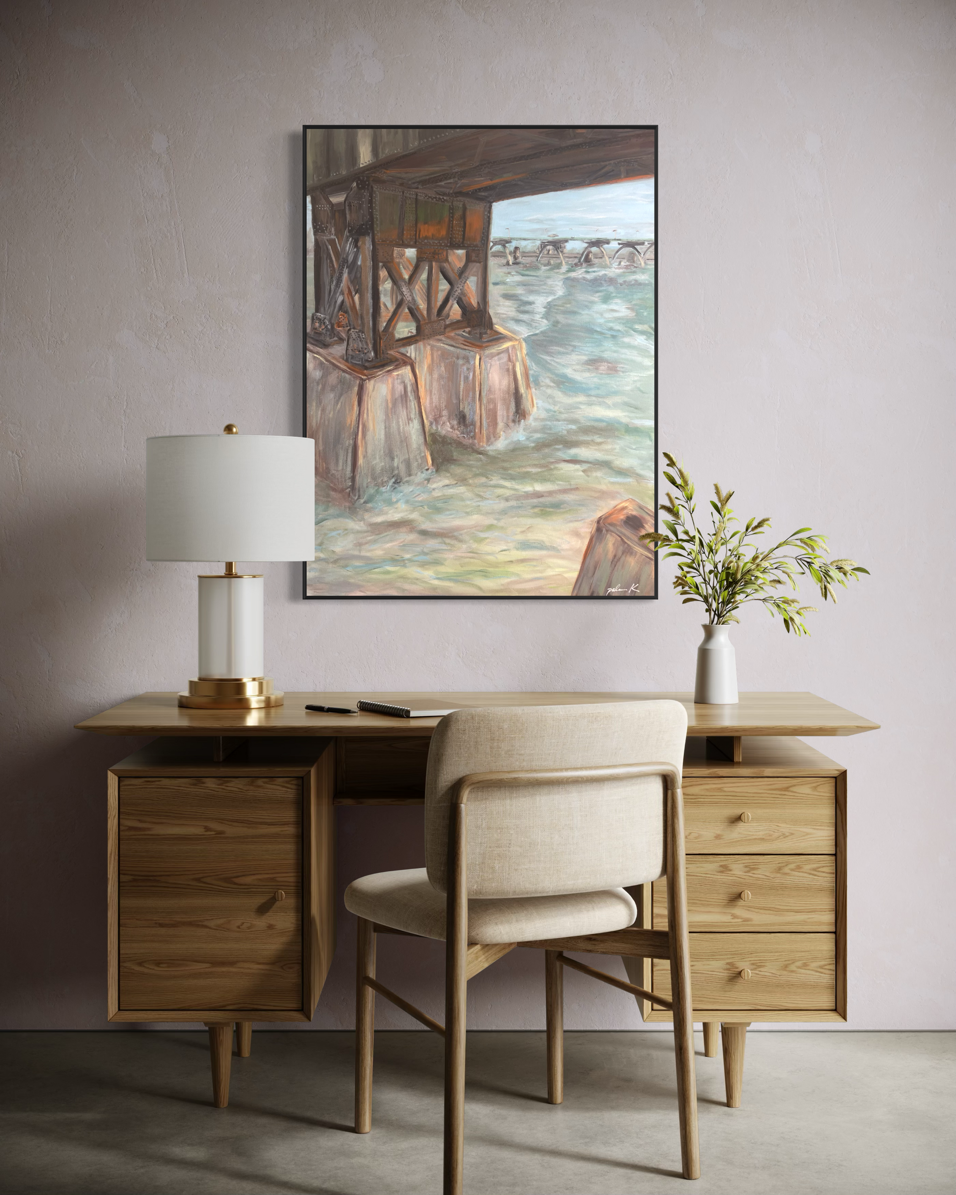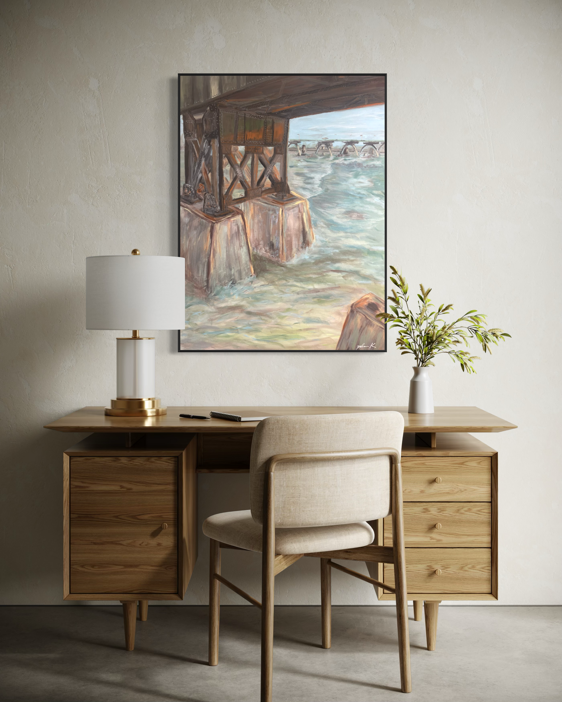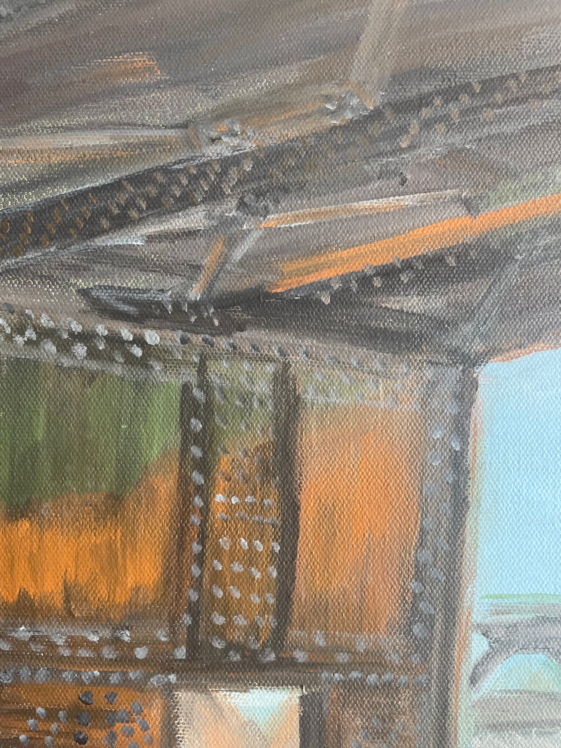 An abstract impressionistic painting of the railroad bridge along the James River at Browns Island in Richmond, VA