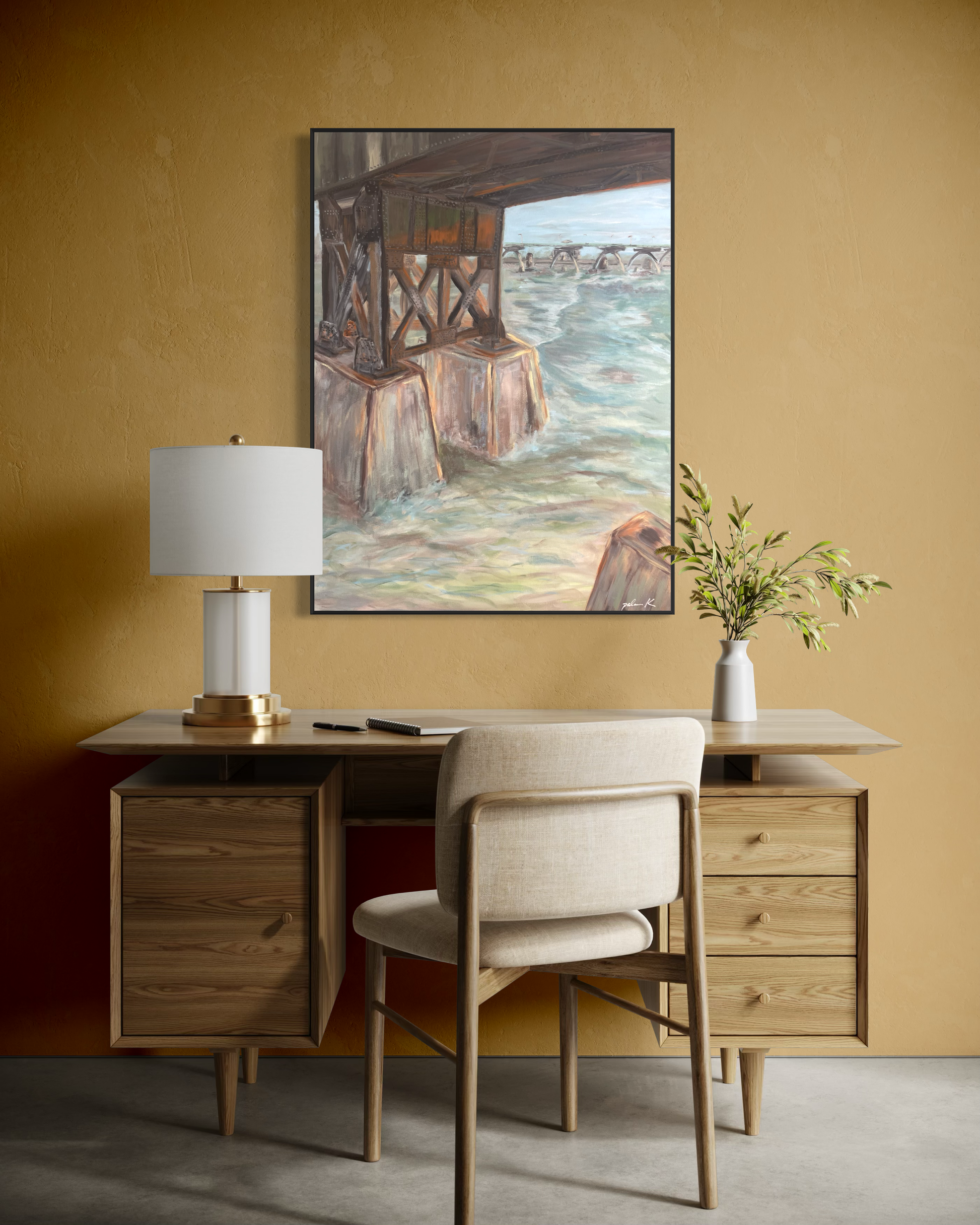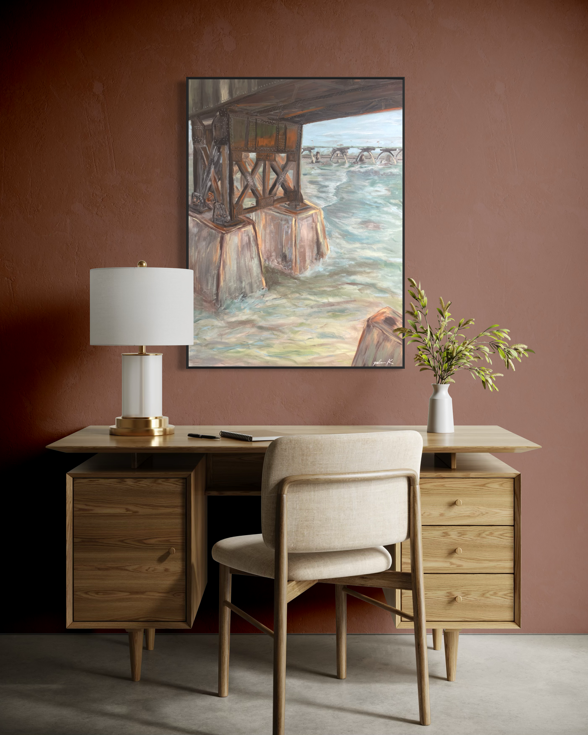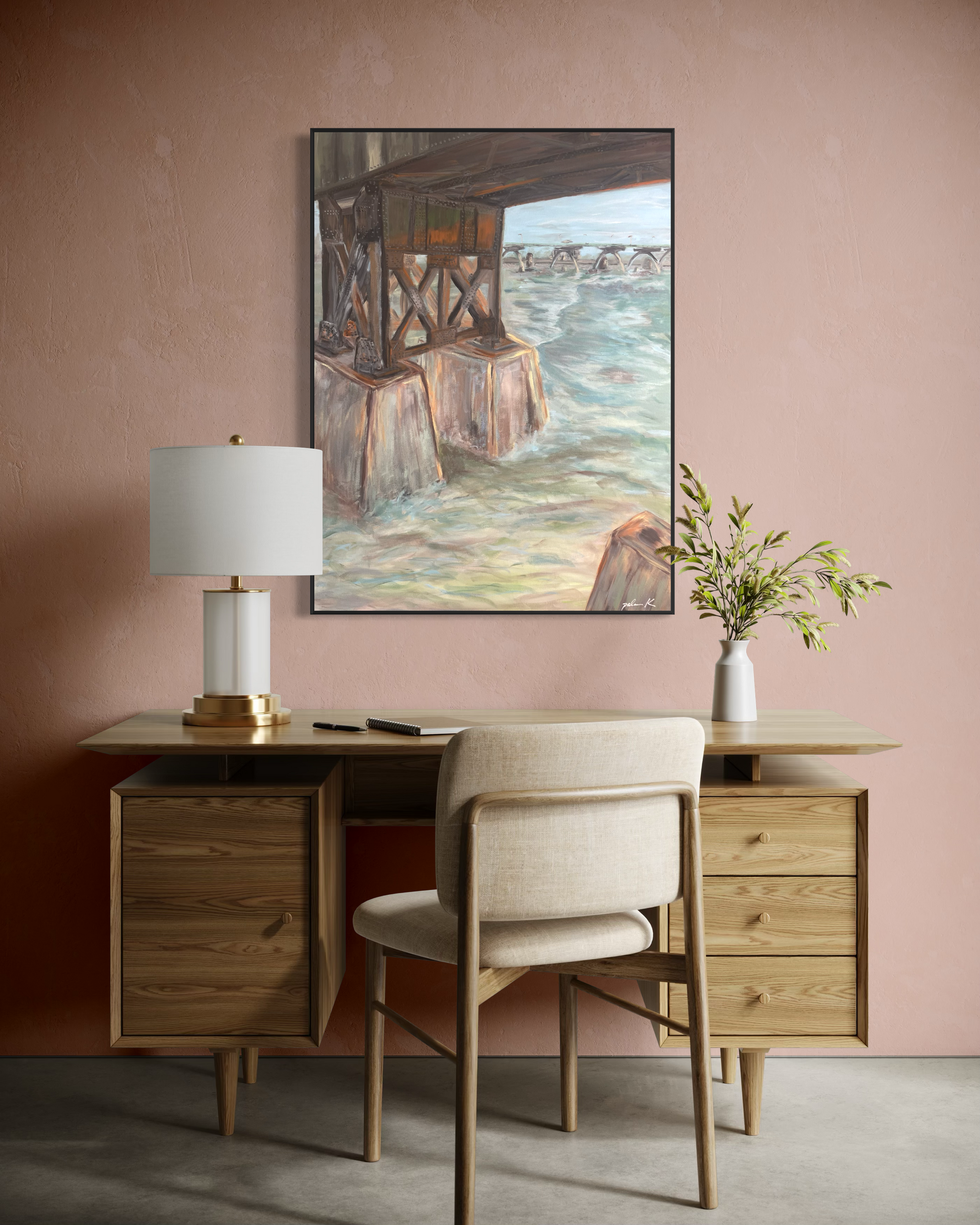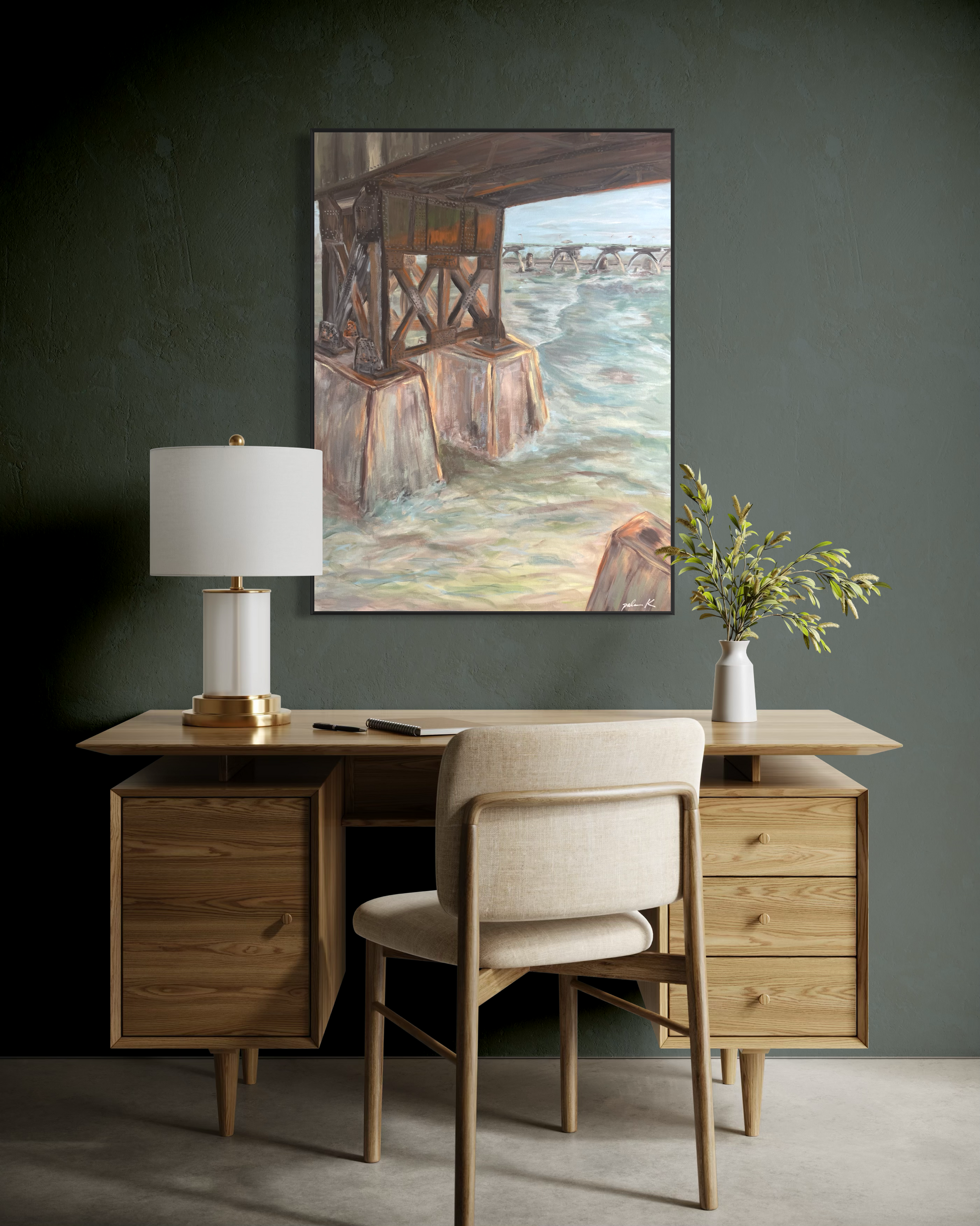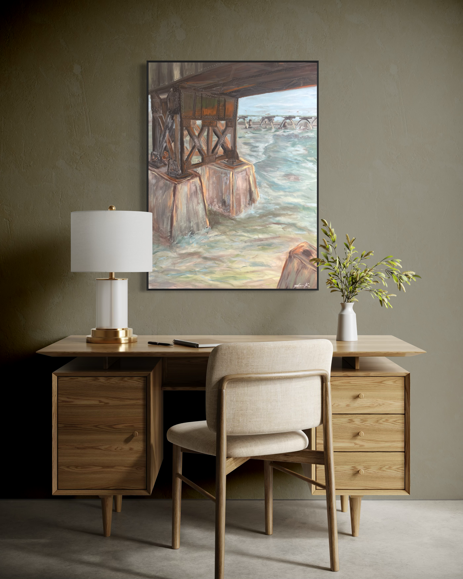 An abstract impressionistic painting of the railroad bridge along the James River at Browns Island in Richmond, VA